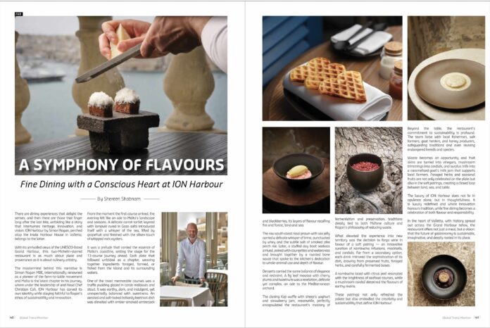 Beyond the table, the restaurant’s commitment to sustainability is profound. The team liaise with local fishermen, salt farmers, goat herders, and honey producers, safeguarding traditions and even reviving endangered breeds and species. Waste becomes an opportunity and fruit skins are turned into vinegars, mushroom trimmings into cordials, and surplus milk into a caramelised goat’s milk jam that supports local farmers. Foraged herbs and seasonal fruits are not only celebrated on the plate but also in the soft pairings, creating a closed loop between land, sea, and table. The luxury of ION Harbour does not lie in opulence alone, but in thoughtfulness. It is luxury redefined and where innovation honours tradition, while fine dining becomes a celebration of both flavour and responsibility.