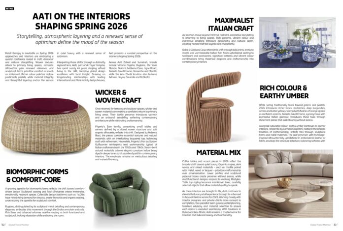 As these interiors are brought to life, Aati continues to elevate the luxury retail experience through its enhanced in-house interiors service for 2026. Workingclosely with interior designers and private clients from concept to completion, the specialist team guides spatial planning, furniture advisory and material selection to ensure each vision is executed seamlessly. With locations in Dubai and Abu Dhabi, Aati remains a trusted name for interiors that balance beauty and functionality.