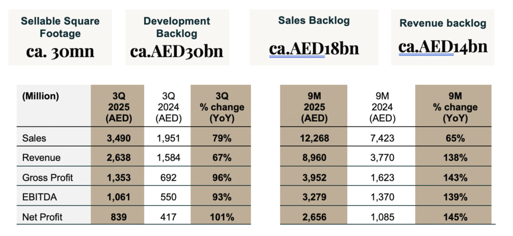 The company’s revenue backlog stood at ca. AED 14 billion as of 30 September 2025, supported by sustained sales and continued demand from both domestic and international buyers.