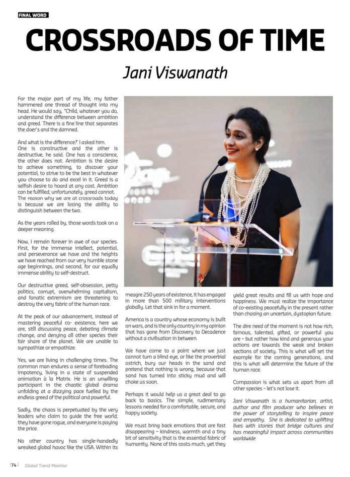 Jani Viswanath is a humanitarian, artist, author and film producer who believes in the power of storytelling to inspire peace and empathy. She is dedicated to uplifting lives with stories that bridge cultures and has meaningful impact across communities worldwide.