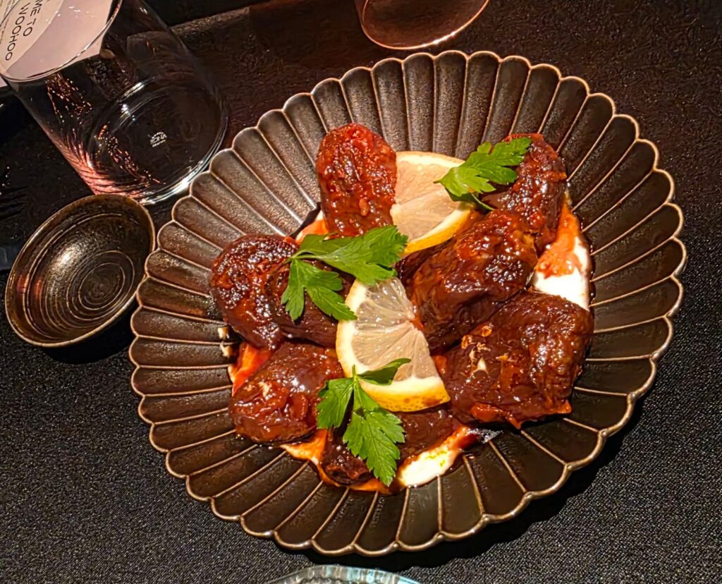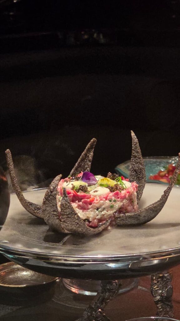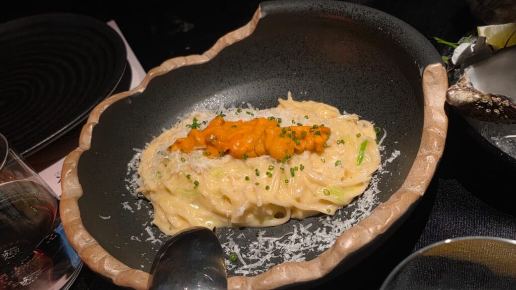 Woohoo’s full à la carte menu remains available throughout Ramadan, so we were also able to explore its more experimental side. Signature creations such as Dinosaur Tartar, Wagyu skewers and meat stuffed ravioli which showcases the restaurant’s bold AI-driven philosophy, executed with precision. We also enjoyed a delectable tartare made from what chef calls dinosaur style “prehistoric meat.” As there was a pescatarian on our table, Chef generously curated numerous sushi platters, some sashimi and even did a special creamy pasta dish with sea urchin which was mouthwatering.