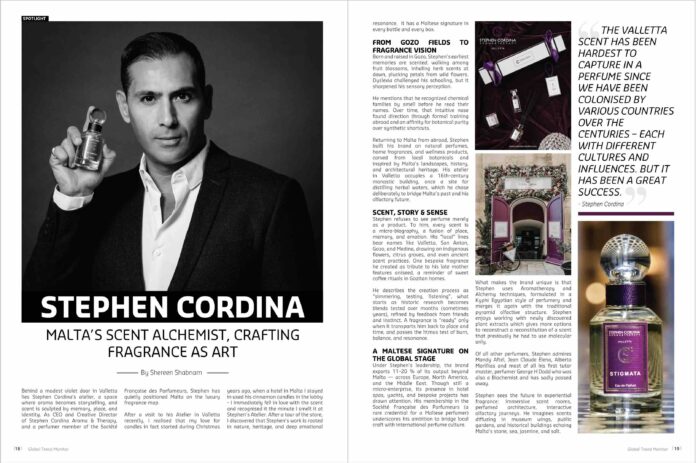 Behind a modest violet door in Valletta lies Stephen Cordina’s atelier, a space where aroma becomes storytelling, and scent is sculpted by memory, place, and identity. As CEO and Creative Director of Stephen Cordina Aroma & Therapy, and a perfumer member of the Société Française des Parfumeurs, Stephen has quietly positioned Malta on the luxury fragrance map.