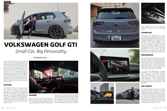 The 2026 Golf GTI proves that you don’t need to go electric, oversized or overly complicated to stay relevant. It is still one of the most balanced performance cars on the market—fun, practical and effortlessly cool. For a Gen Z driver like myself, it is the perfect mix of being sporty enough to enjoy, smart enough to live with, and iconic enough to feel like you are driving something that actually matters.