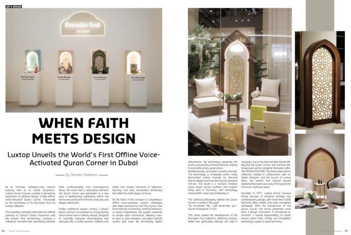 At an intimate, invitation-only cultural evening held at its Dubai showroom, Luxtop Home Couture unveiled a pioneering expression of spiritual design: a fully offline, voice-activated Quran Corner, introduced as the centrepiece of its Ramadan Soul by Luxtop collection.